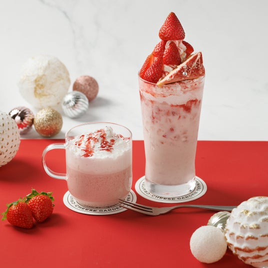 今回の『BERRY MERRY Christmas』では、クリスマスカラーの“赤×白”を“苺×チーズ”で表現した、チーズガーデンならではの大人可愛いクリスマスシーズン限定のカフェメニューです。苺とさまざまなチーズが織りなすチーズスイーツドリンクやスイーツプレート、チーズケーキの全5品を販売いたします。
