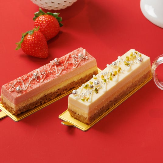 バターとアーモンドの風味豊かなクッキー生地に、オーストラリア産クリームチーズを使用したベイクドチーズケーキと、フランス産苺ピューレとオーストラリア産マスカルポーネチーズを使用したなめらかな食感のレアチーズケーキを重ねました。ホワイトチョコレート、ストロベリーパウダー、アザランでデコレーションしたクリスマスシーズンにぴったりなスティックタイプのチーズケーキです。