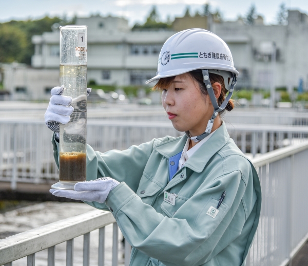 昨年から鬼怒川上流・北那須浄化センターにて、下水処理場の維持管理を行っています。具体的には、運転操作業者との打ち合わせ、巡視による水質や運転管理状況の確認や指導などの監督業務にあたります。下水処理場では、機械や電気だけではなく、微生物を活用して下水に含まれる有機物質を分解・処理します。活性汚泥中の微生物は、流入してくる下水の汚れ具合や温度などによって種類や数が異なります。それらを調査し、下水の処理状態を把握するわけですが、人の手で完全に制御できないからこそ難しくもあり、面白くもあります。絶え間なく動き続ける設備の状態や水質を、五感を研ぎ澄ませて観察できるのは現場でしか体験できない楽しさです。