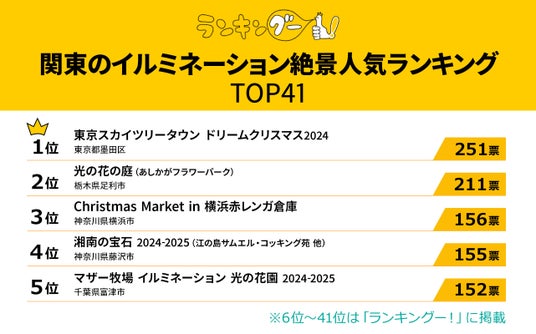 ランキングー!では2024‐2025年に開催される、関東のイルミネーションをピックアップし、ランキングを調査。10~50代の男女(性別回答しないを含む)4,521名にアンケートを行い、同率票を含むTOP41を決定しました。ここではTOP5をご紹介します。