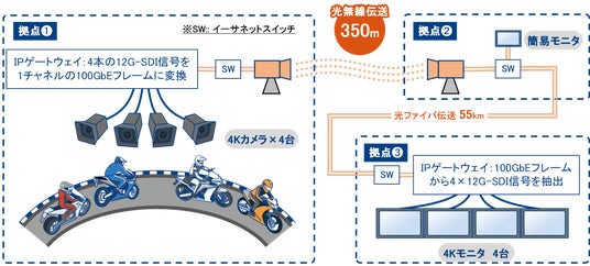 国立大学法人三重大学(代表提案者、本部:三重県津市、学長 伊藤正明、以下、三重大学)、株式会社日立国際電気(本社:東京都港区、代表取締役社長執行役員 佐久間嘉一郎)、デクセリアルズ フォトニクス ソリューションズ株式会社(本社:栃木県下野市、代表取締役社長 林部 和弥)、株式会社KDDI総合研究所(本社:埼玉県ふじみ野市、代表取締役所長 中村 元)、東洋電機株式会社(本社:愛知県春日井市、代表取締役社長執行役員 松尾 昇光、以下、東洋電機)は、2024年10月27日(日)、三重県鈴鹿市の鈴鹿サーキットで撮影した4チャネルの非圧縮4K映像を、オールオプティカル型光無線伝送システムと光ファイバ伝送システムを経由して55km離れたケーブルテレビ事業者の社屋までライブ伝送するフィールド実証(以下、本実証)に成功しました。既設光ファイバを含む実フィールドで光無線技術を使った4K非圧縮マルチチャネル映像の伝送(100Gbpsの通信)は世界初※です。(図1)