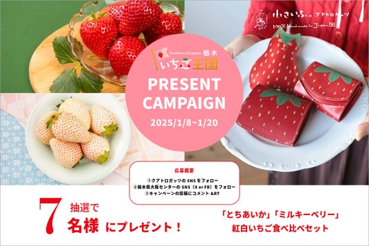「クアトロガッツ」(代表:中辻大也)は、1月8日より「いちご王国・栃木」とのコラボキャンペーンを開催します。栃木の新品種いちご「とちあいか」をモチーフにしたアイテムや、1月15日の「いちごの日」を記念したプレゼントキャンペーンを実施。詳細はこちら https://quatrogats.com/?mode=grp&gid=2810569