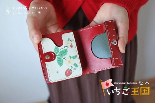 国産最高峰「栃木レザー」100%使用。いちご「とちあいか」をモチーフにデザインされ、お財布を開くとハート型の断面があらわれる遊び心たっぷりデザインです。手のひらサイズながら、お札・カード・コインをしっかり収納。旅行やミニバッグにもぴったりです。