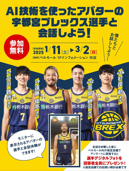 このような取組みの一環として行われる本実証実験では、AIを活用した映像対話システムを使い、公益社団法人ジャパン・プロフェッショナル・バスケットボールリーグ(B.LEAGUE)に所属する「宇都宮ブレックス」の選手のアバターと、サイネージを通じて対話体験ができる新しい形のファンエンゲージメントを提供します。なお、サイネージは宇都宮市内のショッピングモール内に設置し、店舗との連携を行うことで、消費行動の促進や回遊性の向上を図ります。