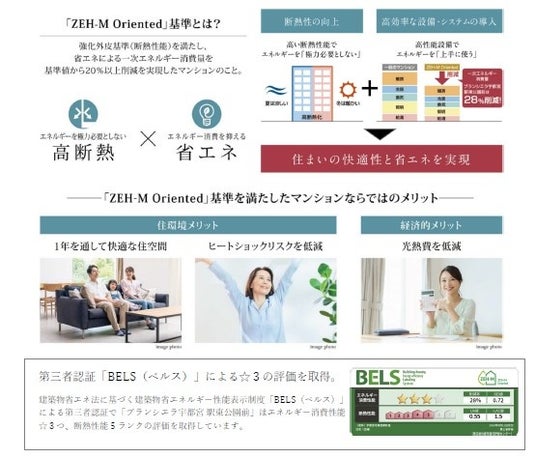 本物件は、強化外皮基準(断熱性能)を満たし、省エネによる一次エネルギー消費量を基準値から20%以上削減(本物件では28%削減)を実現したマンションとして、「ZEH-M Oriented」基準を満たします。