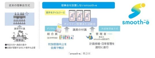 本物件では今注目を集める理事会を設置しない「外部管理者方式」をベースに、デジタル技術を活用した新しいマンション管理サービス「smooth-e(スムージー)」を導入します。従来の理事会方式では、入居者の中から理事を選出し運営に携わりますが、「smooth-e」では長谷工コミュニティが管理者となり、入居者に代わって日常管理など専門的な業務を遂行します。入居者はパソコンやスマートフォンを使って気軽にマンション管理に関わることができます。
