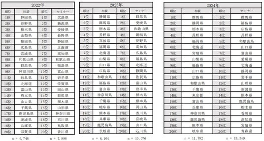 セミナー参加者は2年連続、群馬県が1位となった。大きくランクアップしたのは2位の福島県(前回8位)、3位の広島県(前回7位)、6位の山口県(前回19位)、7位の富山県(前回12位)だった。