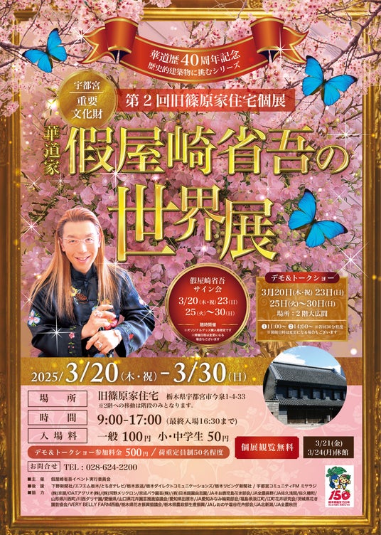 華道歴40周年を迎えた元祖華道家 假屋崎省吾が旧篠原家住宅で2回目となるいけばな展覧会を開催することに伴い、3/19(水)16時より先行メディア内覧会を開催いたします。