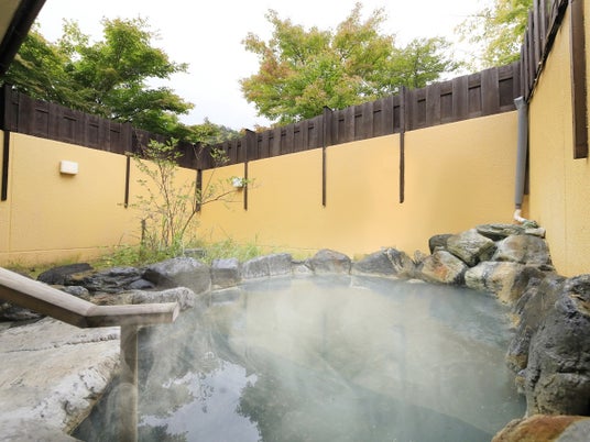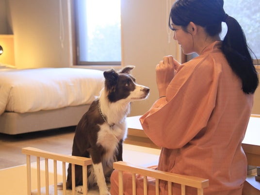 宿自慢の3本の源泉から溢れるかけ流しのにごり湯を大浴場や露天風呂でじっくりと堪能いただけ、さらに日本庭園ドッグランや肉球スタンプ付の絵馬、ウェルカムサービスなど和のおもてなし体験で愛犬とともにほっこり湯けむりステイをお愉しみいただけます。