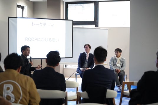 レセプションパーティでのトークセッションの様子。こちら向き左から横木氏、金児氏、平宅氏