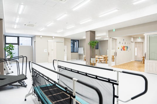 デイサービスの運動スペースを写した写真。合計150m2を超えるデイサービスの運動スペースは夕方からダンスの習い事をするスペースへと早変わりします。