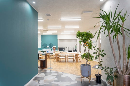共有スペースから中央を向けて撮られた写真。温もりのある緑や木製のテーブルが暖かな印象を与えます。