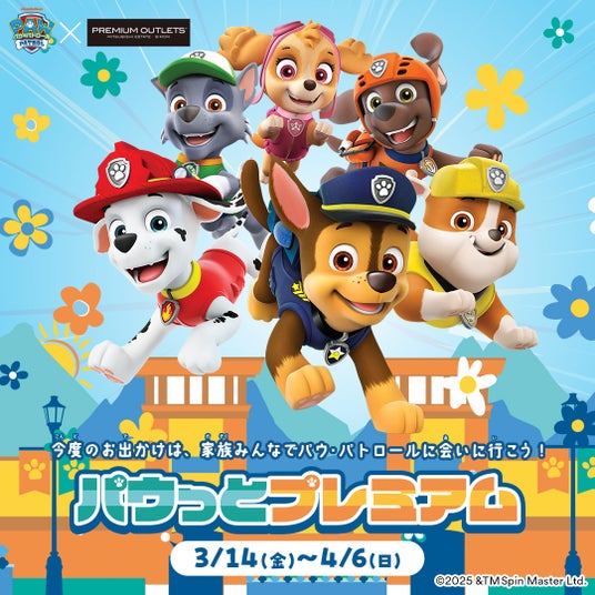 関東圏のプレミアム・アウトレット5施設※(運営:三菱地所・サイモン株式会社)では、大人気アニメ「パウ・パトロール(TM)」とコラボレーションし、『今度のお出かけは、家族みんなでパウ・パトロールに会いに行こう!パウっとプレミアム』イベントを、2025年3月14日(金)~4月6日(日)の期間、初開催します。