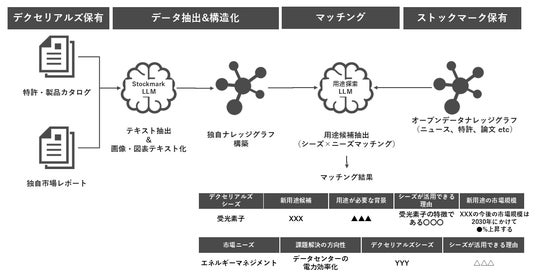 これらの課題を解決するために、2024年からストックマーク株式会社(本社:東京都港区、社長:林 達、以下、ストックマーク社)の生成AI技術を活用し、新規用途探索における「アイデア創出」のためのツールを構築すべく検証を続けてまいりました。本検証では、1.AI が当社固有の言葉・表現を理解、日々更新される社内外の情報に対応、2.当社独自調査レポートからの正確な情報抽出と構造化、3.市場情報や世の中のトレンド(ニーズ)を起点とした当社技術とのマッチング提案の実施という1.から3.の精度を確認することができました。