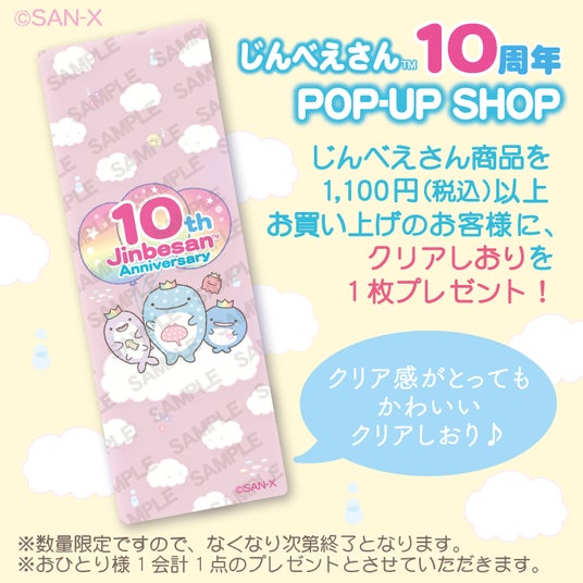 本POP-UP SHOPでは、じんべえさん商品を1,100円以上(税込)お買い上げの方に、クリアしおりを1枚プレゼントします。おひとり様1会計1点、数量限定のプレゼントです。