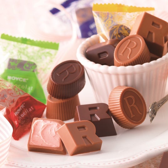 フルーツやナッツのクリームなどが入ったひと口ショコラ。ロイズの頭文字“R”をモチーフにした2つのカタチに、ジャンドゥーヤ、ストロベリー、ミルクココア、レモンの4種類の味わいを閉じ込めました。