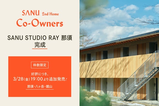 シェア別荘サービス「SANU 2nd Home(サヌ セカンドホーム)」を提供する株式会社Sanu(本社:東京都目黒区/代表:福島 弦)は、共同オーナー型セカンドホーム「SANU 2nd Home Co-Owners」の新拠点、『SANU STUDIO RAY 那須』が2025年3月29日(土)に開業することをお知らせします。那須の森を臨む高台に位置する『SANU STUDIO RAY 那須』は、SANU 2nd Home初の全室温泉付き、さらに一部プライベートサウナが付いた仕様。完成を記念し、好評につき完売した八ヶ岳・館山と合わせて購入枠を新たに追加し、本日3月28日(金)19:00より追加販売を開始します。