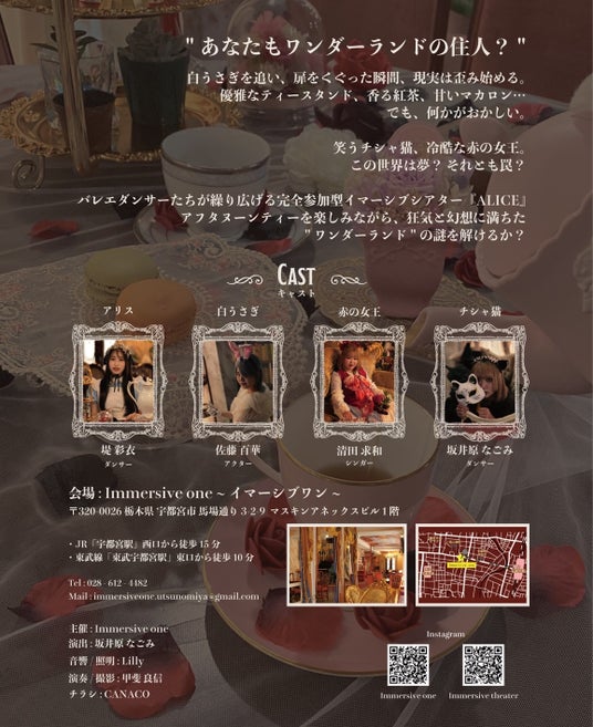 本イベントでは、観客はただの傍観者ではなく、物語の登場人物としてアリスの世界に巻き込まれる体験を味わいます。各シーンでの出会いや選択が、物語の空気感や展開に変化をもたらすかもしれません。予定調和ではない、少しずつズレていく物語のゆらぎもまた、演出の魅力です。観劇と参加の境界を曖昧にし、観客自身が物語と関係する全く新しい非日常体験を創出します。