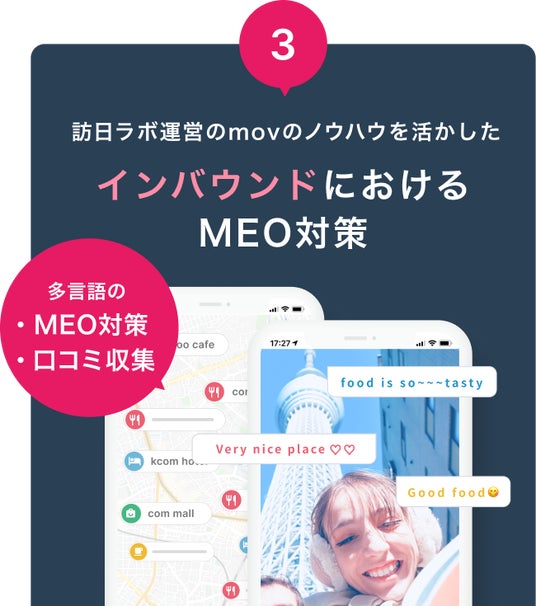 口コミコムではインバウンド対策において重要なGoogleマップや大衆点評ほか海外サイト、自社HPの店舗検索ページを一括で管理・運用できます。また、口コミコムを提供するmovは、業界最大級のインバウンドビジネスメディア「訪日ラボ」を運営しており、その豊富な知見やノウハウを活かしてMEO対策をご支援します。