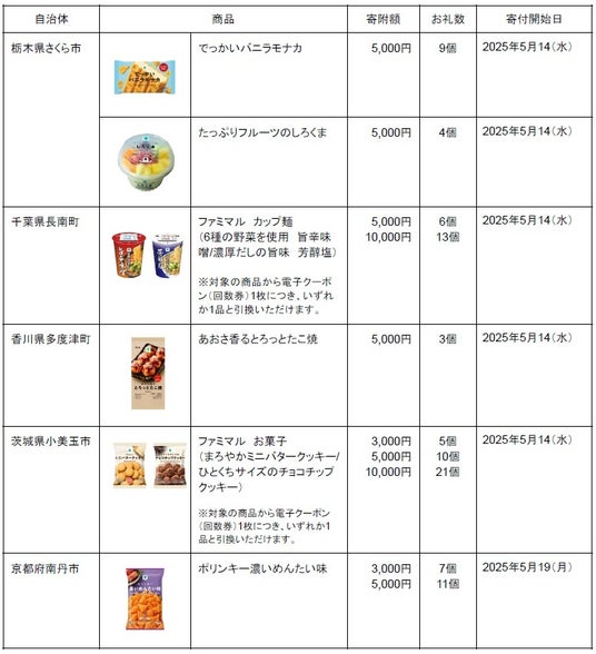 株式会社ファミリーマート(本社:東京都港区、代表取締役社長:細見研介)は、継続して取り組んでいる5つのキーワードの「たのしいおトク」「『あなた』のうれしい」の一環として、「お礼品がすぐに全国の店舗で引換可能」な「ファミマふるさと納税」から、新たに「茨城県小美玉市」、「栃木県さくら市」、「香川県多度津町」、「千葉県長南町」、「京都府南丹市」の5自治体8商品を、2025年5月14日(水)10時から順次追加いたします。