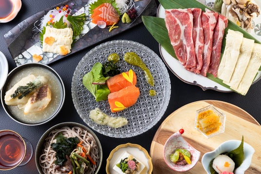 夕食は、春の味覚を盛り込んだ「春の日光誉会席」1コースをご用意。4月から7月のメインは、国産の鰹節と鮪節から丁寧にとった和風の合わせ出汁に、香ばしい胡麻の香りをブレンドした「和出汁鍋」でご用意。ブランド豚「日光HIMITSU(ひみつ)豚」のキメが細かく、秘密にしたくなるような甘みと繊細な旨味、そして日光特産の「生湯波」のとろりとした食感をお楽しみいただけます。