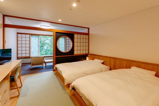 名所「いろは坂」を上り、中禅寺湖や戦場ヶ原を過ぎると、標高約1,500メートルの湯ノ湖のほとりに休暇村日光湯元が建ちます。シラカバやカラマツの木々に彩られたホテルは、建築家“清家清”氏のデザインで、周辺の自然に溶け込む佇まいは四季の移ろいが感じられ、戦場ヶ原ハイキングや日光東照宮など世界遺産めぐりの拠点にも便利。日本で4番目に濃い硫黄泉と言われる「日光湯元温泉」から引いた源泉かけ流しの温泉が楽しめます。
