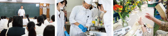 ※(左・中央)那須拓陽高等学校 食物文化科と八芳園シェフによるメニュー開発、(右)那須塩原ブランドである赤松材の経木を活用したワークショップを開催