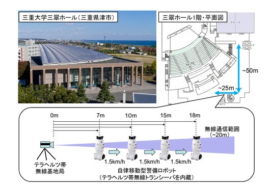 国立大学法人三重大学(代表提案者、本部:三重県津市、学長 伊藤正明、以下、三重大学)、株式会社国際電気(本社:東京都港区、代表取締役社長執行役員 佐久間嘉一郎、以下、国際電気)、デクセリアルズ フォトニクス ソリューションズ株式会社(本社:栃木県下野市、代表取締役社長 林部 和弥、以下、DXPS)、株式会社KDDI総合研究所(本社:埼玉県ふじみ野市、代表取締役所長 小西 聡、以下、KDDI総合研究所)、東洋電機株式会社(本社:愛知県春日井市、代表取締役社長執行役員 松尾 昇光、以下、東洋電機)は、2025年2月19日(水)、三重県津市の三重大学 講堂・三翠ホールにおいて、走行中の自律移動型警備ロボットとの間で、独自に開発したテラヘルツ帯トランシーバを用いてGbps級で高速通信するフィールド実証(以下、実証1.)」に成功しました。自律移動する警備ロボットとのGbps級テラヘルツ帯通信実験は世界初※です。(図1)