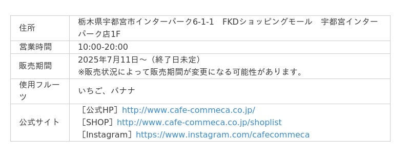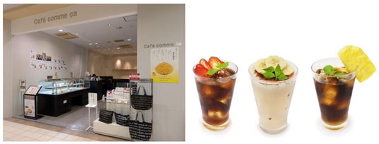 (株)コムサ(東京都渋谷区)が展開するカフェ業態「カフェコムサ」の、3店舗にてフルーツコーヒーを提供します。「カフェコムサ」は日本中・世界中の産地、農園から厳選した旬のおいしいフルーツを使用したスイーツなどを提供しており、日本の四季を感じられるアート感覚溢れるケーキを提供しています。いちご、パイナップル、バナナのフルーツコーヒーを提供予定です。いちごは栃木県産の「なつおとめ」を使用し、アレンジには産直いちごの生産・販売などを手掛ける「ベリーベリーとちぎ」が作るいちごシロップも使用します。またパイナップルは沖縄県の「TOK:iファーム」が作るパイナップルとパインジュースを使用したご当地フルーツコーヒーを提供します。