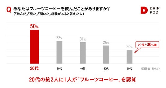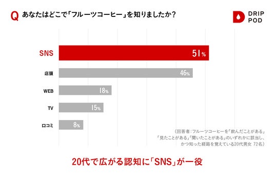 Point 3:若年層中心に広まる新感覚「フルーツコーヒー」は20代の約2人に1人が知っている!広がる認知にSNSが一役。