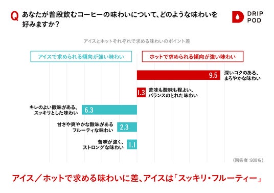 Point 1:コーヒーに求める味わいは温度で変化?アイスは「スッキリ・フルーティー」、ホットは「コク・バランス」。特に20代は「フルーティー」志向が顕著に。