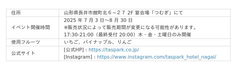 2024年4月にリノベーションし、リニューアルオープンした「タスパークホテル長井」で7月より開催予定のサマーフェスタにて飲み放題メニューの1つとしてフルーツコーヒーを提供します。夏季限定で開催しているビアホールイベントで、クラフトビールの飲み比べや地元食材を使った料理などを楽しむことができます。いちご、パイナップル、りんごを使用したフルーツコーヒーを提供します。