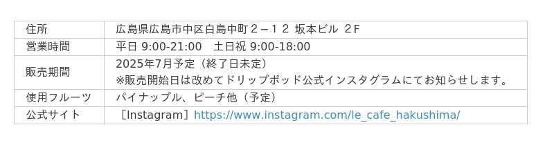様々なドリップポッドのコーヒーカプセルを使ったおうちでも楽しめる「フルーツコーヒー」のレシピを、公式メディア「UCCドリップポッドマガジン」およびドリップポッド公式Instagram(https://www.instagram.com/ucc_drippod/)で6月中旬より順次公開予定です。アレンジに使用するフルーツはスーパーマーケットやコンビニエンスストアなどでも手に入りやすい冷凍フルーツや缶詰、ジャムなどを使用しており、ご自宅でも気軽に「フルーツコーヒー」にチャレンジできます。なお、ドリップポッド公式オンラインストア(https://drip-pod.jp/)でも本企画と連動したドリップポッド専用カプセル6箱セットを順次販売予定です。ドリップポッドのカプセルとそれぞれ相性の良いフルーツを組み合わせることで、様々な味わいのフルーツコーヒーを楽しむことができます。