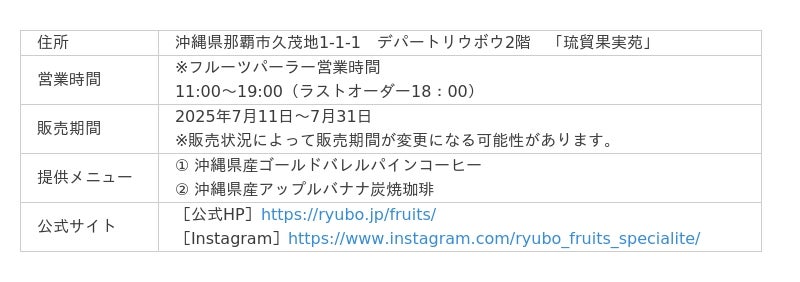 那覇市のデパートリウボウ2階に位置する高級フルーツ専門店。全国各地から厳選されたフルーツの販売と、併設されたフルーツパーラーでの贅沢なフルーツ体験を提供しています。今回提供するのは琉貿果実苑で販売しているフルーツのうち、希少な沖縄県産のゴールドバレルパイン、アップルバナナを使用した、2種類のご当地フルーツコーヒーを提供します。
