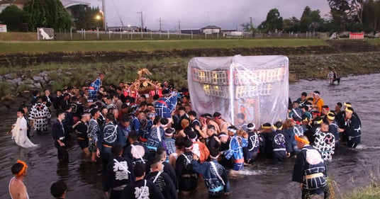 若衆が担いだ勇壮な神輿が五行川を渡る「神輿川渡御(かわとぎょ)」