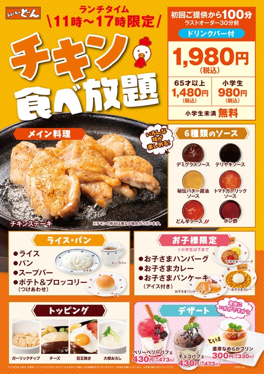 もちろん、ライス・パン・スープバー、さらにドリンクバーもご利用いただける、「チキンステーキ」を、思いのままに楽しめるラインナップ。年齢別価格を設定しており、小学生以下のお子様向けメニュー4つも食べ放題ラインナップに含まれております。