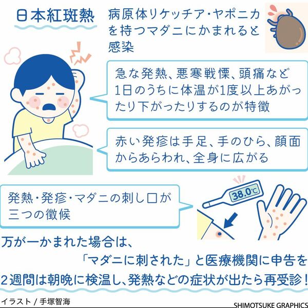 野原や草むらにいる身近なマダニにかまれて発症する感染症で、今回は日本紅斑熱をご説明しましょう。早期に診断して、適切な抗菌薬で治療を開始しなければ、死に至ることもあります。栃木県でも感染者の報告はありますので、注意したいマダニ感染症です。