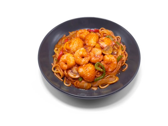 ・メニューの説明文:エビとイカが入ったぷりっとリッチなナポリタン。ナポリタンソースとピリ辛チリソースのバランスが絶妙。