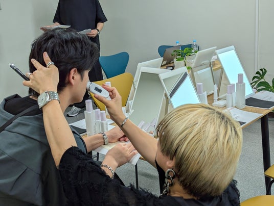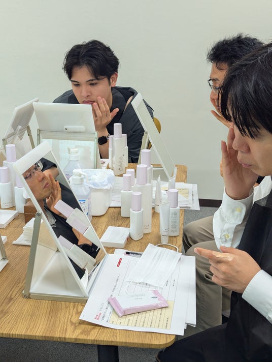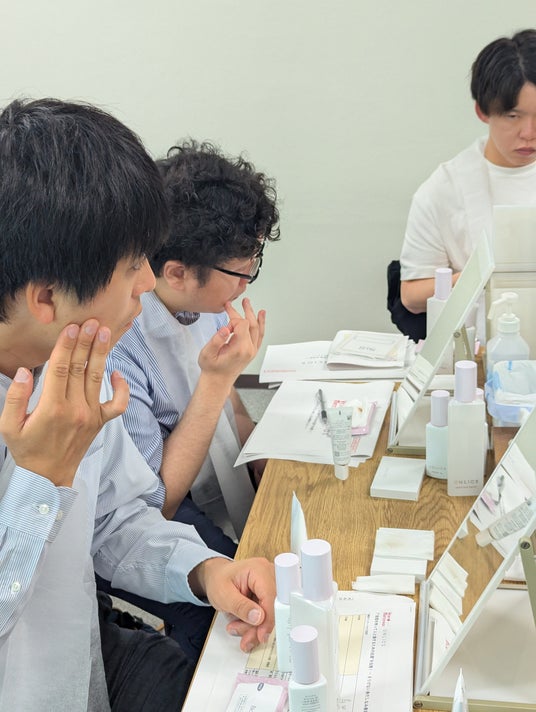 ベースメイクのセッションでは、モデルへのデモンストレーションを通じて、メイクバレすることなく肌を綺麗に見せるメイク方法を伝授。参加者一人ひとりを丁寧にサポートしつつも、基本的には参加者自らが仕上げる形式で行い、翌日から自分ひとりでも再現できる実践的なスキルを身につけました。参加者は自身の肌の見た目が変わっていくことを楽しみながら、美容のスキルを習得していました。