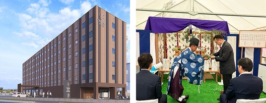 写真左から「たびのホテル宇都宮ゆいの杜」外観完成予想パース、地鎮祭にて、当社 代表取締役社長 柳村 一幸