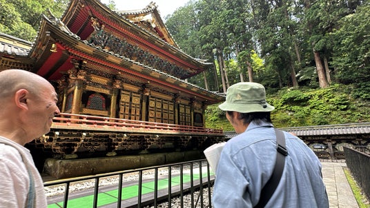 シンポジウム共催者である幾何楽堂 小坂氏とともに日光山輪王寺 大猷院(たいゆういん)を回る。周辺環境と人工建造物の融合、建物土台部分の風通し機能について語り合う。(2025年7月、日光市)