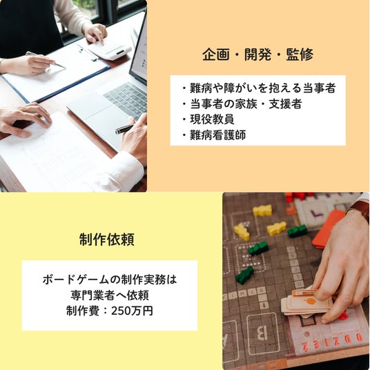 また、子どもたちにも受け入れやすいものとして現役教員が、正しい医療知識として難病看護師が監修として参加いたします。その内容をもとに専門業者へ委託し、遊んで楽しいボードゲームを制作します。