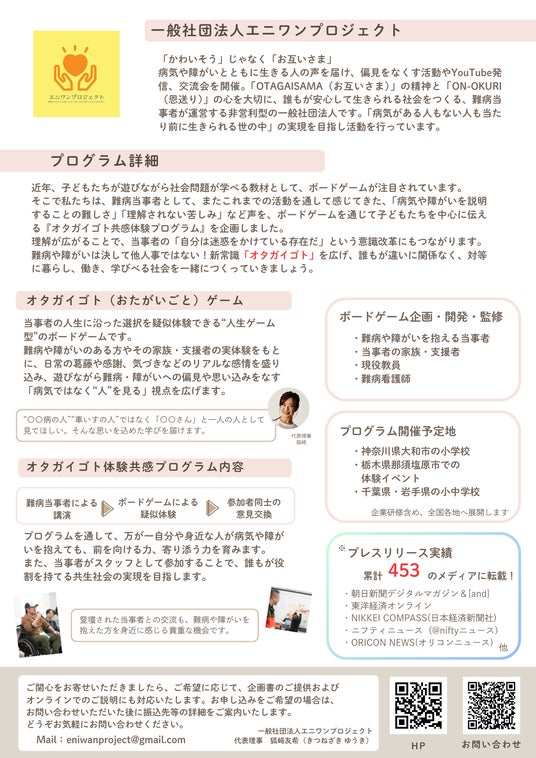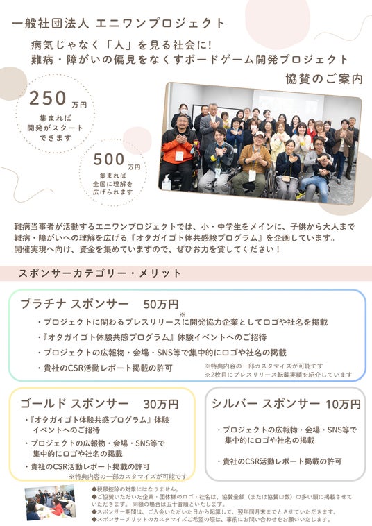 難病当事者3名が、「病気のある人もない人も当たり前に生きられる世の中に」をスローガンに掲げ活動する、非営利型一般社団法人エニワンプロジェクト(本社:東京都練馬区、代表理事:狐崎友希)は、2025年7月24日(木)より、難病や障がいと共に生きる世界を当事者視点で体験できるボードゲームを活用した、新たな共感啓発型プロジェクト『オタガイゴト体験共感プログラム』の実現に向けた支援募集を開始しました。