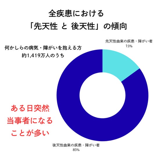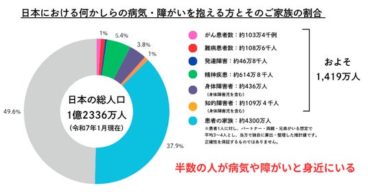 そして、患者1人に対してパートナー・両親・兄弟がいる想定で、家族が平均3~4人で算出すると、日本に住んでいる人の半数の人が病気や障がいと身近にいることになります。