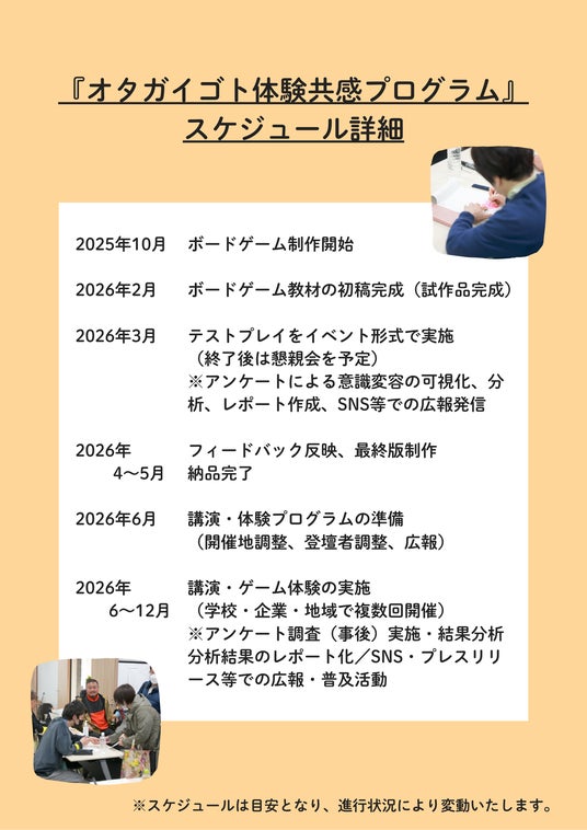 オタガイゴト体験共感プログラムの実現に必要な〈ボードゲーム制作費250万円〉〈全国展開のための運営費〉の資金を集めるため、スポンサー企業・団体、そして個人の応援サポーターを広く募集しています。第一目標として、2025年内にボードゲーム制作費250万円調達を目指します。
