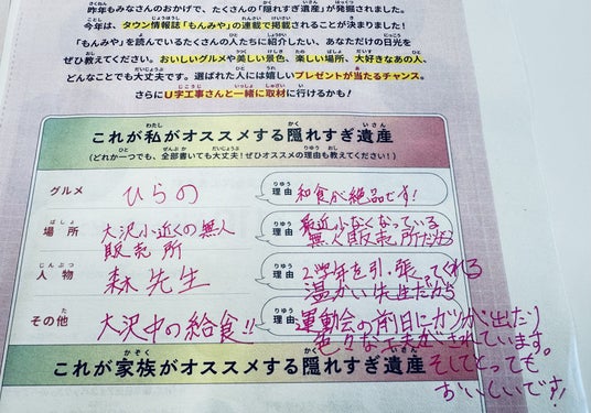 記事を作成するにあたり、事前に市内の小中学生から、「あなただけが知っている、誰かにオススメしたい日光市のグルメ・場所・人など」について募集しました。この結果、合計で600件以上のオススメスポットなどが集まりました。