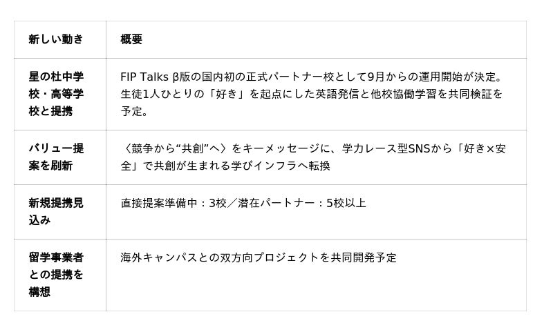 Artivation 株式会社(本社:東京都大田区、代表取締役社長 兼 CEO:中田 涼介〈高校 3 年〉)は、世界中の中高生が3~5分の英語プレゼン動画を共有し合うクローズドSNS 「FIP Talks」β版 のアップデートを行い、星の杜中学校・高等学校(栃木県宇都宮市、校長:小野田一樹)との提携を始め、以下のトピックをお知らせいたします。