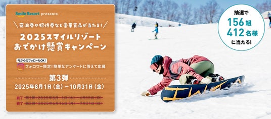 本キャンペーンは全3弾にわたって実施しており、第3弾は2025年8月1日(金)から10月31日(金)まで開催いたします。今回の第3弾では、スマイルリゾートが運営する新潟県内5つのスキー場で利用できるリフト券や、栃木県那須の「那須カントリークラブ」のゴルフプレー券を賞品としてご用意。これから迎えるウィンターシーズンや秋のゴルフシーズンをよりお楽しみいただける内容となっております。スマイルリゾートでは、このキャンペーンを通じて、高原リゾートならではの自然と触れ合いながら、冬のレジャーやゴルフを満喫していただき、心に残るひとときをお届けしてまいります。