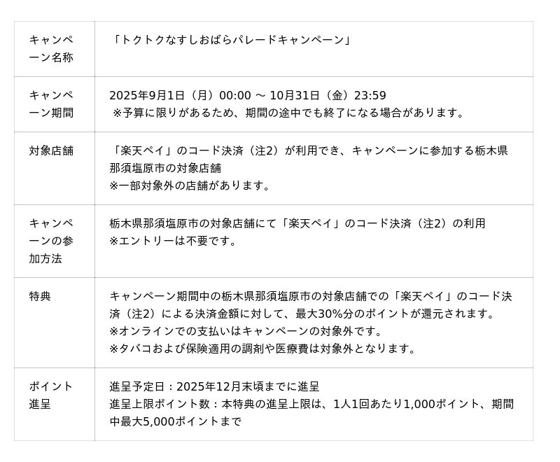 楽天ペイメント株式会社(以下「楽天ペイメント」)は、運営するキャッシュレス決済サービス「楽天ペイ」において、栃木県那須塩原市が2025年9月1日(月)から10月31日(金)まで実施する「トクトクなすしおばらパレードキャンペーン」に参加することをお知らせします。