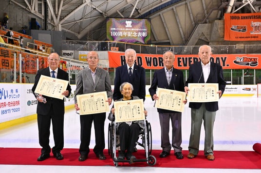 そこで、9月14日(日)の ホームゲーム会場および、9月15日(月・祝)に開催した「100周年記念式典・パーティー」会場にて、 100周年記念表彰「功労賞」受賞者の発表および表彰式を実施いたしましたのでお知らせいたします。